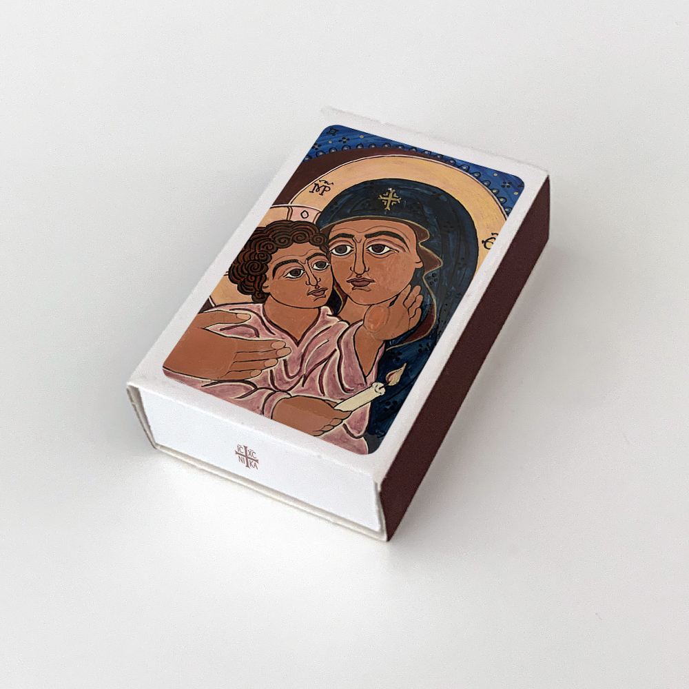 Hand made matchbox featuring artwork by Eugene Avvakoumides. Intended for everyday use or to place by your ikonostasis. Intended to bring the presence associated with the icon into ordinary acts such as lighting a candle, incense / livani, or charcoal.